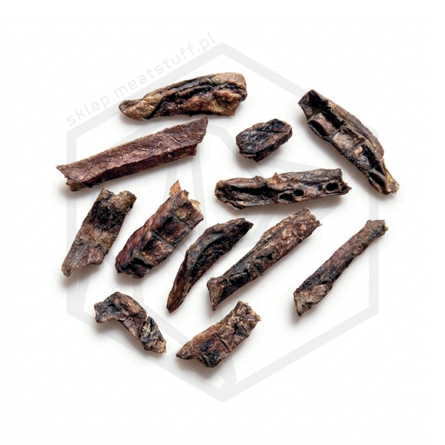 Mięso poddawane jest obróbce mechanicznej, czyli nadaniu odpowiedniego kształtu, a następnie suszone w niskiej temperaturze dla zachowania wartości odżywczych. Ostatnim etapem jest sterylizacja termiczna, która zapewnia bezpieczeństwo produkowanej żywności dla psów.