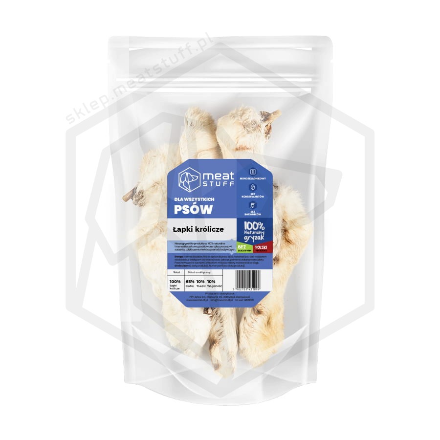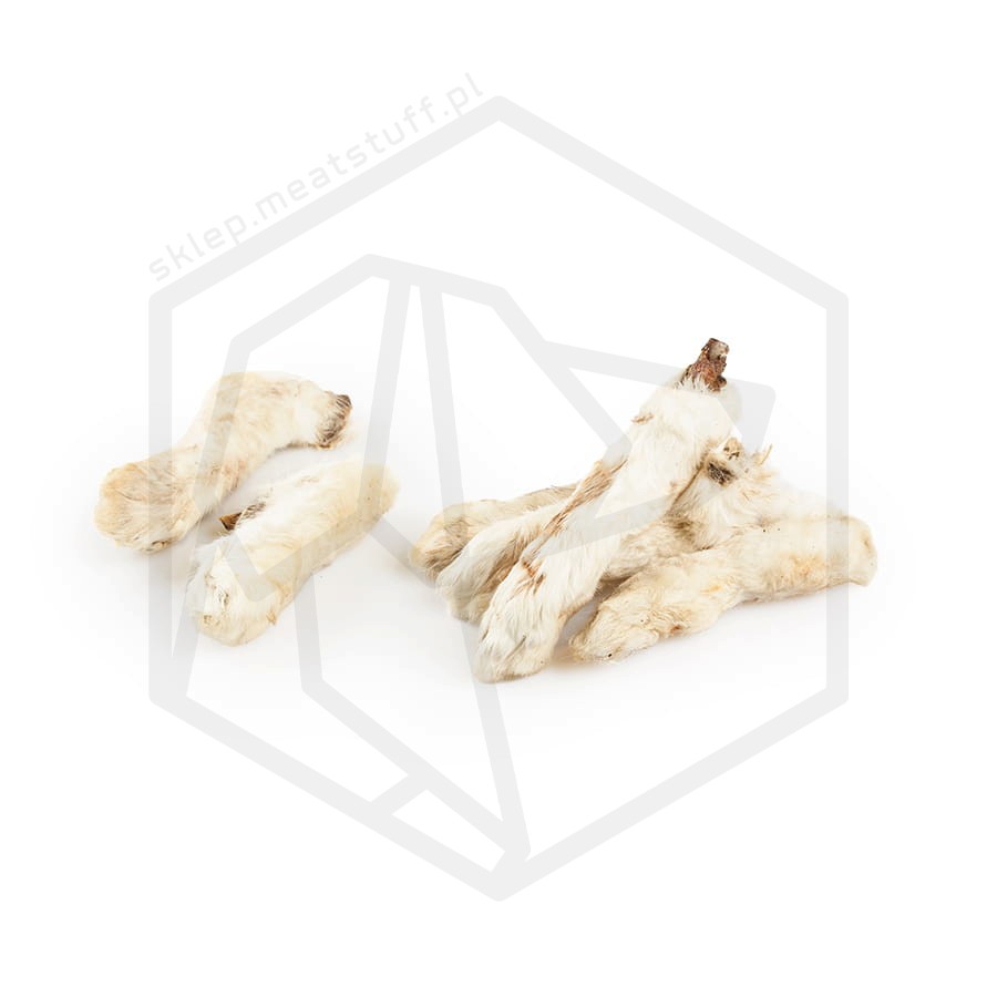 Łapki królicze z futrem to delikatnie suszone naturalne gryzaki. Mają szczególnie niską zawartość tłuszczu i są hipoalergiczne, a tym samym idealne dla psów z wrażliwym układem pokarmowy, skłonnością do alergii lub nietolerancją pokarmową.