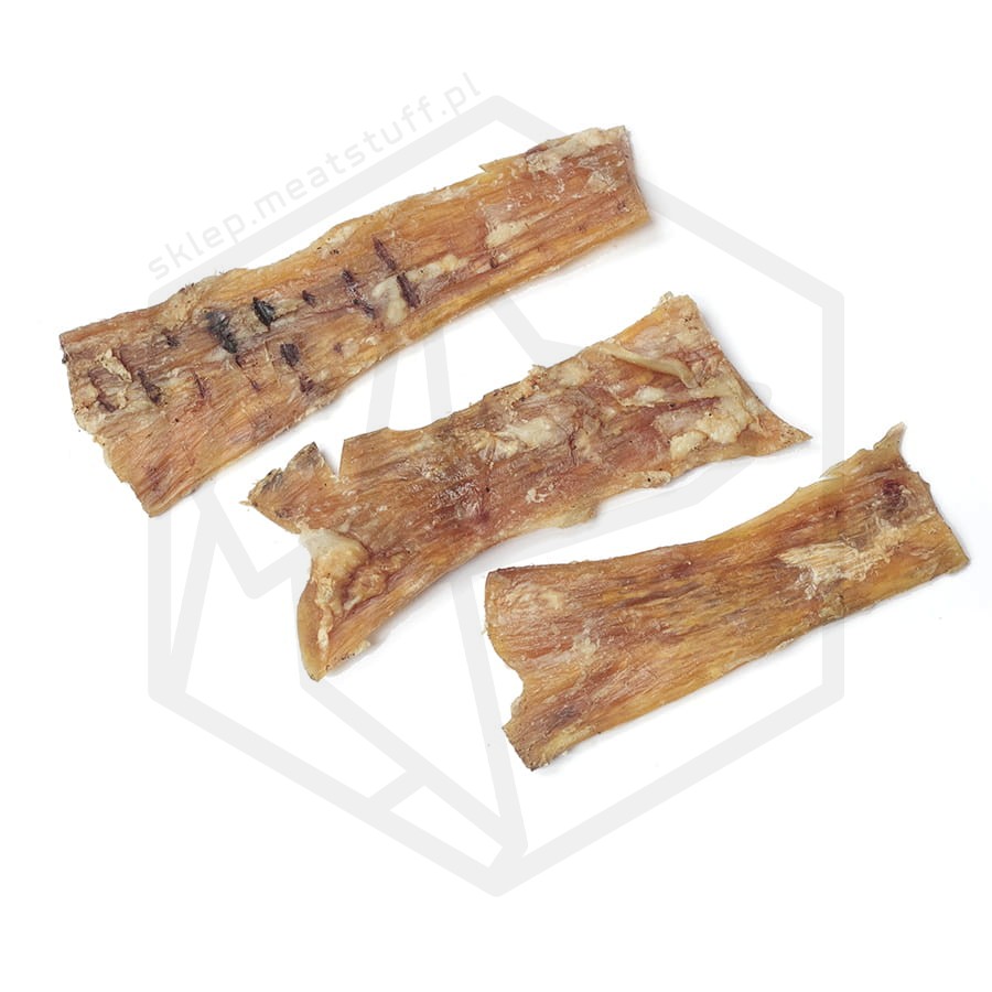 Ścięgna wołowe to wyjątkowo twarde gryzaki, które zajmą psa na dłuższą chwilę. Ich struktura idealnie nadaje się do czyszczenia zębów a zawarty w nich kolagen pozytywnie wpłynie na stawy, sierść oraz pazury. Zawierają dużą ilość białka, dlatego dobrze sprawdzą się jako uzupełnienie diety Twojego psa.