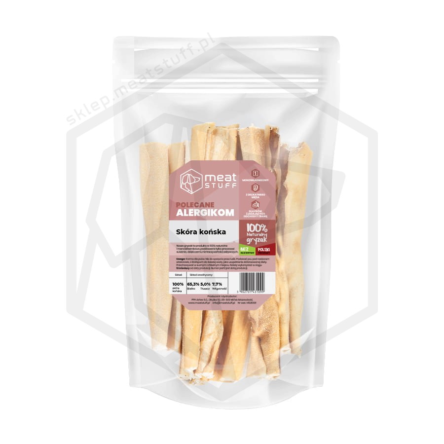 Skóra końska to twardy gryzak, doskonały do żucia z rzadko uczulającej koniny. Dzięki bardzo niskiej zawartości tłuszczu może być spożywany przez psy o wrażliwym przewodzie pokarmowym oraz alergików. Jego struktura wspomaga oczyszczanie zębów oraz zaspokaja naturalną potrzebę gryzienia.