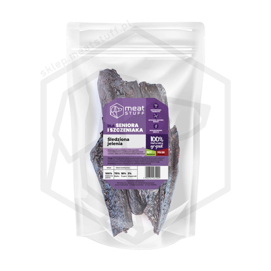 Śledziona jelenia to delikatny i zdrowy przysmak dla psa, zawierający bogactwo aminokwasów, soli mineralnych i witamin z grupy B. Zawiera dużo dobrze przyswajalnego żelaza, a dzięki niskiej zawartości tłuszczu nadaje się dla psów z wrażliwym układem pokarmowych i problemami z trzustką.