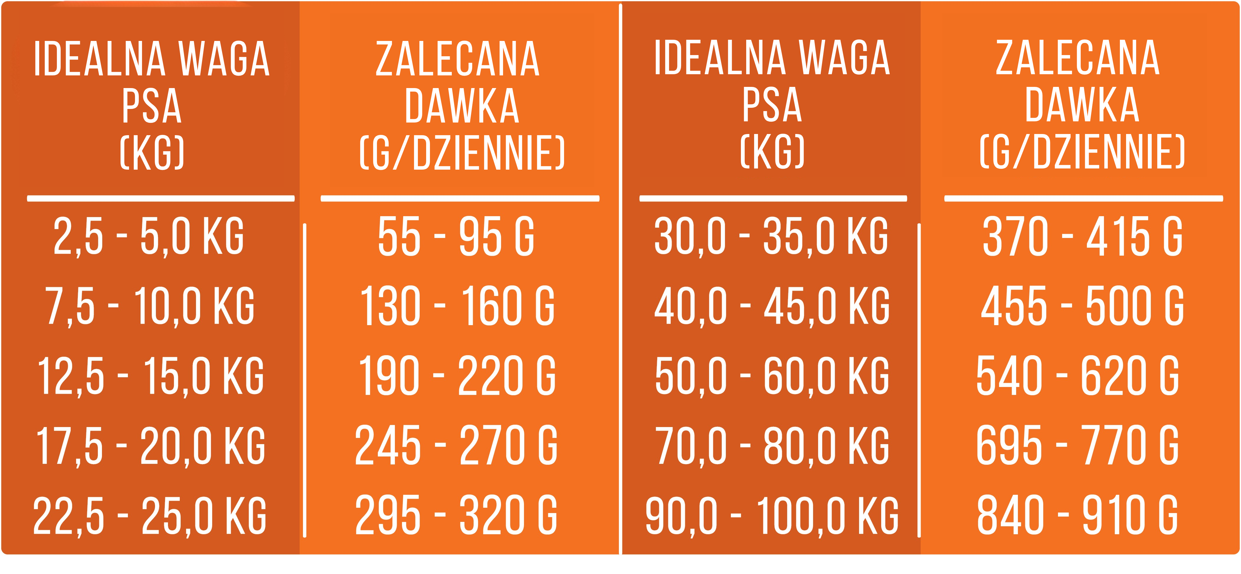 Ta informacja jest jedynie wskazówką. Indywidualne wymagania zależą od takich czynników jak wiek, rasa, aktywność i warunki mieszkaniowe. W przypadku zwiększonej aktywności proszę odpowiednio zwiększyć ilość karmy.