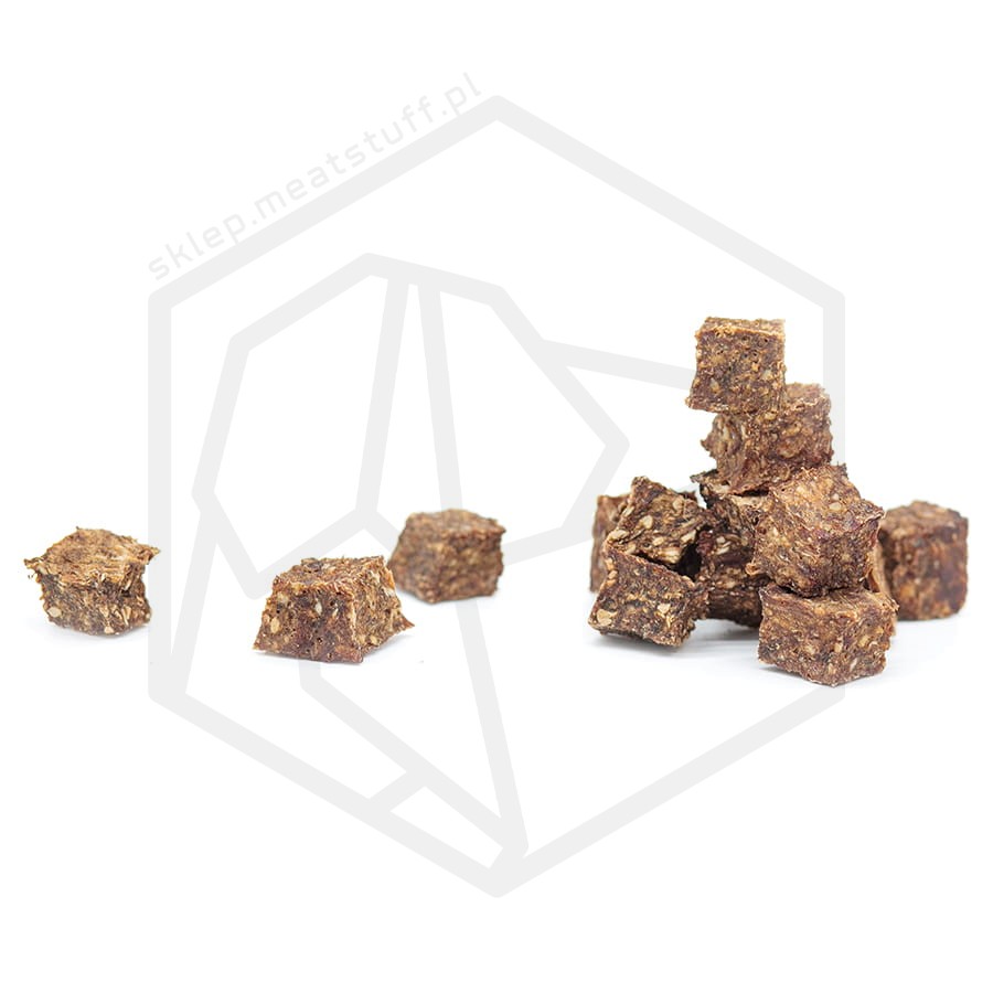 Przysmaki treningowe z królika to wysokiej jakości przysmak w formie półmiękkich kostek z mielonego mięsa królczego. Technologia produkcji pozwala na uzyskanie niekruszących się przysmaków bez dodatku żadnych spoiw typu gliceryna.